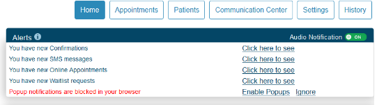 The Alerts window will also notify the practice when the internet browser being used to access Patient Communicator is blocking popup notifications. It is recommended that popups be enabled to allow notifications of incoming patient messages.