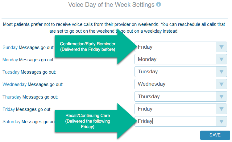 Most patients prefer not to receive voice calls from their provider on weekends. It is possible reschedule all calls that are set to go out on the weekend to go out on a weekday instead. Changing voice settings here will create different changes within specific notifications.