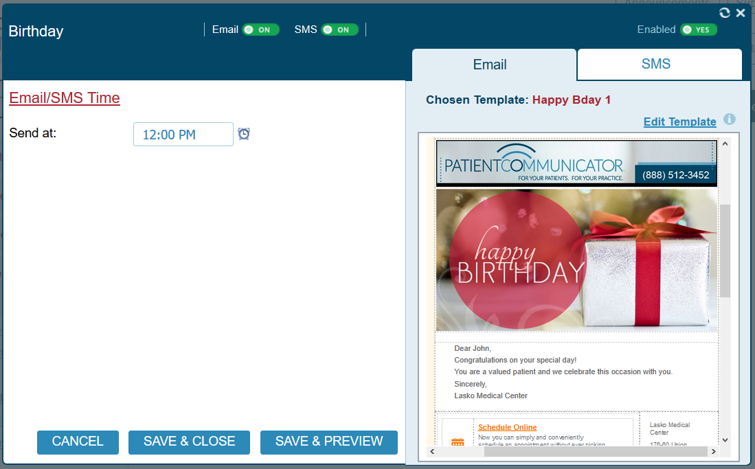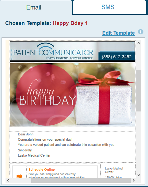 Patient Communicator will search every day to find which of your active patients are celebrating their birthday on that day and send an email and/or sms greeting to the patient.