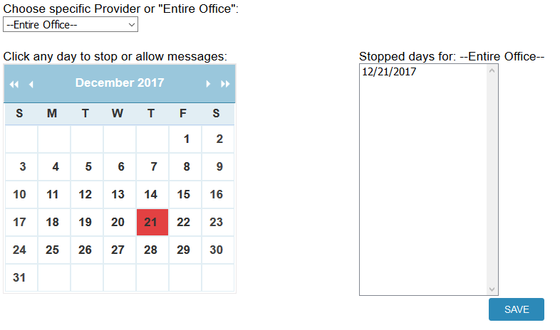 1. Your practice or a specific provider has cancelled appointments for a day in which appointments have been scheduled. Using the Closed Days feature will immediately stop messaging for appointments on the selected day(s).