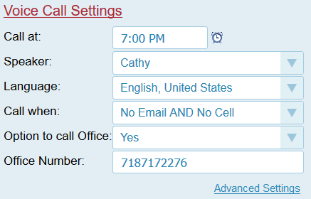 7. Voice: Continuing Care notifications have the option to deliver a voice message to the patient’s home phone. We recommend using the voice feature to your patients with no email or cell phone contact information to ensure that your recall message is delivered. To enable an automated voice call update the settings below: