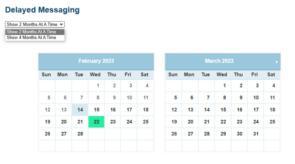 - Choose to see either 2 or 4 months at a time. Days enabled with SEND LATER messaging will show in green.