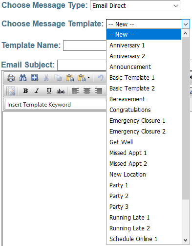 Patient Communicator uses Keywords within your templates. Keywords are recognized by the % before and after the keyword. When used, the keyword will be automatically filled when the message is sent. You may insert keywords from the editor found on the screen. Just click Insert Template Keyword.