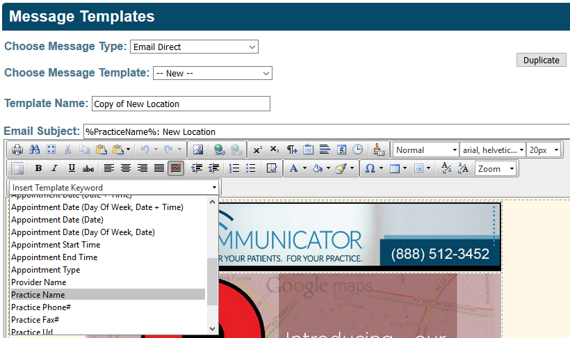 Patient Communicator uses keywords within your templates. Keywords are recognized by the % before and after the keyword. When used, the keyword will be automatically filled when the message is sent. You may insert keywords from the editor found on the screen.