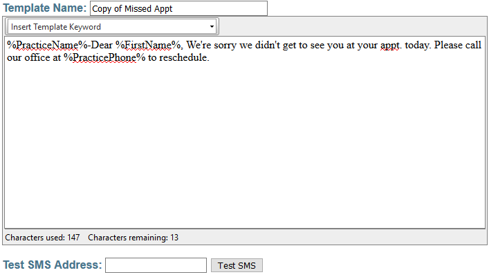 This is approximate as the auto-fill creates an unknown amount of characters. If your message is close to 160 characters, send a test Sms to your cell phone. Just enter your cell phone number in the Test SMS Address field and click Test SMS. If your test message is delivered in full, you may save the message and use the template.