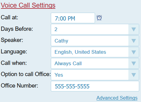 4. Voice Confirmations: A request to confirm an upcoming appointment can be made to the patient’s home phone. To enable an automated voice call: