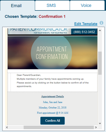Each notification will preload with a default template when the message delivery method is turned on. Email and Voice templates will have 2 options. Templates names with 1 will include the names of all patients scheduled that day and the earliest appointment time only.