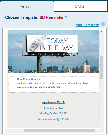 Each notification will preload with a default template when the message delivery method is turned on. Email templates will have 2 options. Template names with 1 will include the names of all patients scheduled that day and the earliest appointment time only. Template names with 2 will include every patient with an appointment that day list the appointment time for each individual patient.
