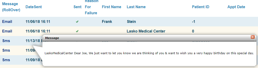 Hover your mouse over the message type in the left hand column to view the exact message sent to your patient.
