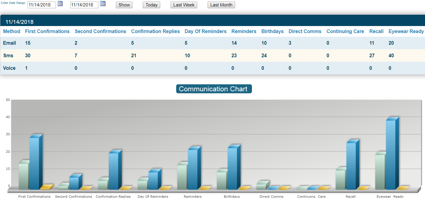 The default screen will show a record of outbound automated messaging to your patients so far that day. You may also search for specific dates or a date range with the ability to filter your results.