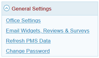 General Settings contain settings and functions important to most practices. Most settings have been pre-populated during the on-boarding setup.