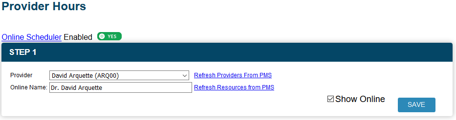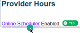 To enable providers for the Online Scheduler (OLS) go to Settings > Online Scheduler Settings > Provider Hours.