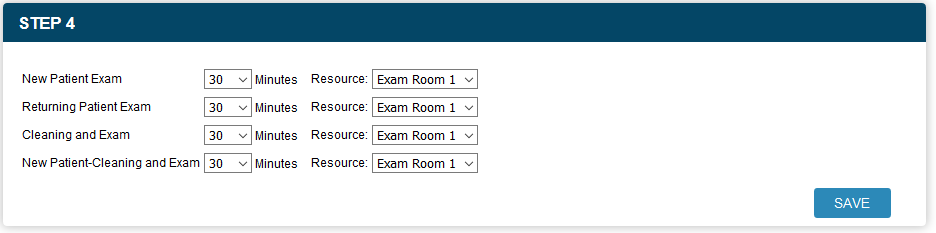1. Each selected appointment type will appear with the default appointment length created in Online Appointment Types. If an adjustment needs to be made to the default appointment time for this provider only, it may be done here.