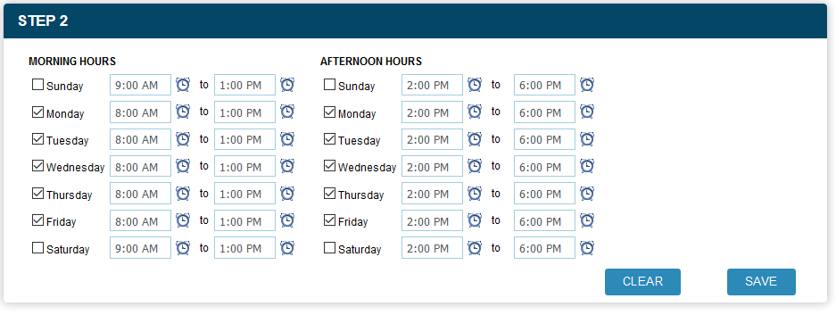 1. Select the days and hours of provider availability. The right hand columns in the Morning and Afternoon Hours are the end time of the last available appointment. Patient Communicator will never allow the booking of an appointment which will result in ending later than this time. It is possible to create a mid-day break by using both the left and right columns.