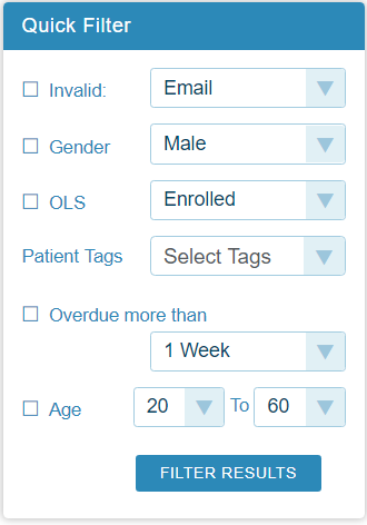 The results of any Patient Search may be filtered using a number of filtering options. Results will be shown on the right side of the screen.