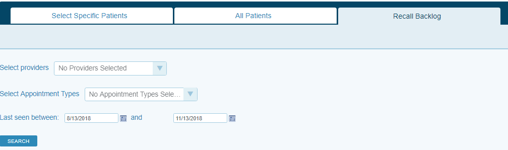 This feature is made available only to those practices who don’t have Recall Wizard available. You will be able to search for patients based on their last visit to your practice for a specific appointment type. To open, click on Communication Center > Recall Backlog.