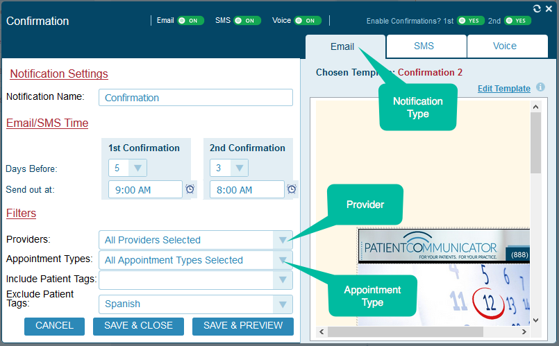 All providers, appointment types, and patient information used by Patient Communicator were uploaded from your practice management system into the system at the initial on-boarding. Your system automatically sees all patients, providers, and appointment types within the Schedule and Unconfirmed Breakdowns. To ensure those patients get their scheduled notifications, we update the Providers and Appointment Types daily and enable them for messaging within any notification that sends messages to All Providers or All Patients. Where notifications have specific providers or appointment types selected (filtered), a manual refresh of the system will need to be done along with manually updating the notifications with any new provider or appointment type to be added to trigger the notification(s) to be sent.
