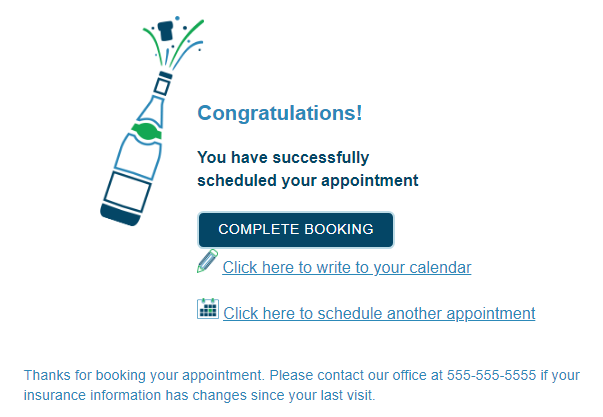 - If you have opted to redirect your patient to another website, the Complete Booking button be visible.