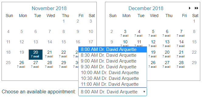 3. Your patient can now select a date where, based on their preferred appoint time, appointments are available, then choose the available appointment time from the drop down list.