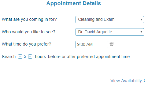 2. Once your patients have selected the reason for their visit, they will be asked to select an available provider, select a preferred time for their appointment, and how many hours before or after the preferred appointment time they would accept an appointment. They will then click View Availability to access the calendars.