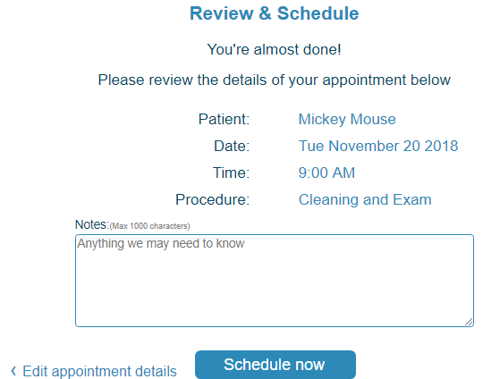 The patients may then review their selection, add a note to the practice, and complete the booking by clicking Schedule now.