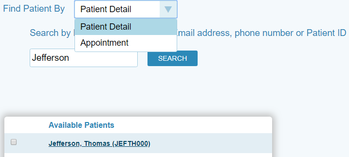 Search by Last Name, First Name, First Name Last Name, Email address, phone number or Patient ID and click SEARCH. The patient(s) will appear in the Available Patients column.