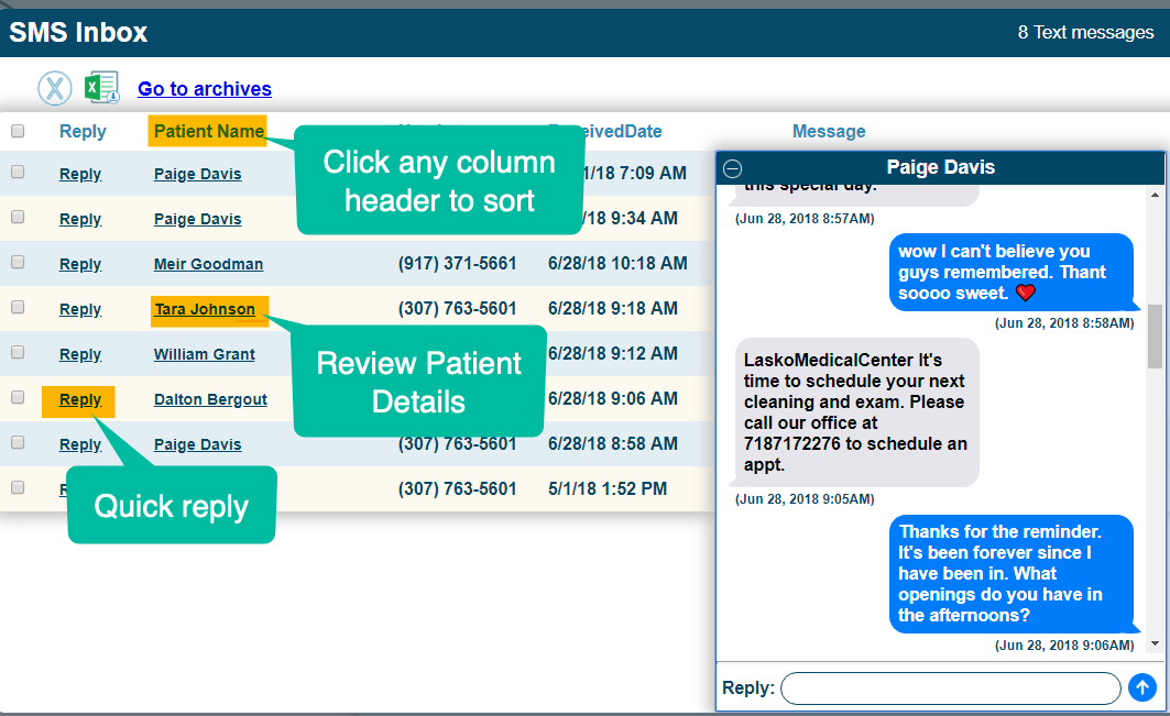 Quick Reply: Click the Reply link. Enter your reply in the Send SMS to Patient popup window, and click send.