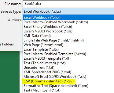 Two lines will appear. The upper line is where you will name your document, the lower line will be the format to save as. Choose CSV (Comma Delimited) (*csv)