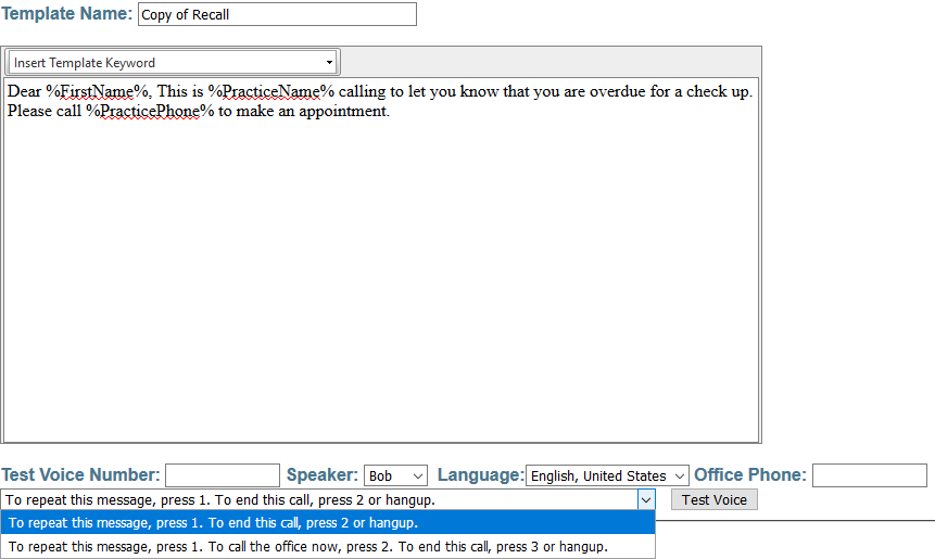Once your message has been edited, you may perform a test to hear what the message delivered to your patient’s will sound like.