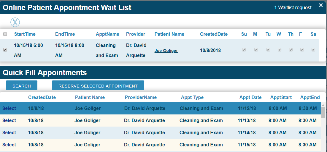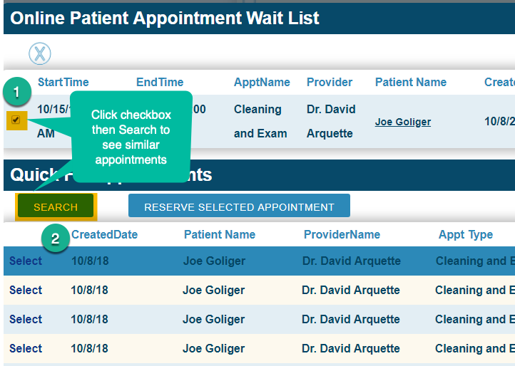 To see similar appointments in the next 30 days to the preferred appointment time your patient selected during the OLS booking process, click the check box in the left column, then click Search. A list of similar available appointment for the next month will appear.