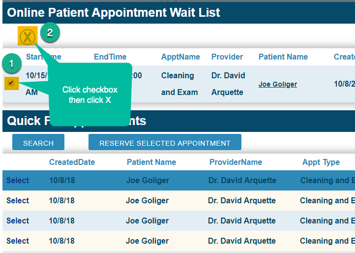 To delete the waitlisted patient from the window without creating a new appointment from the list of available appointments, click the check box at the left, then click the “X”.